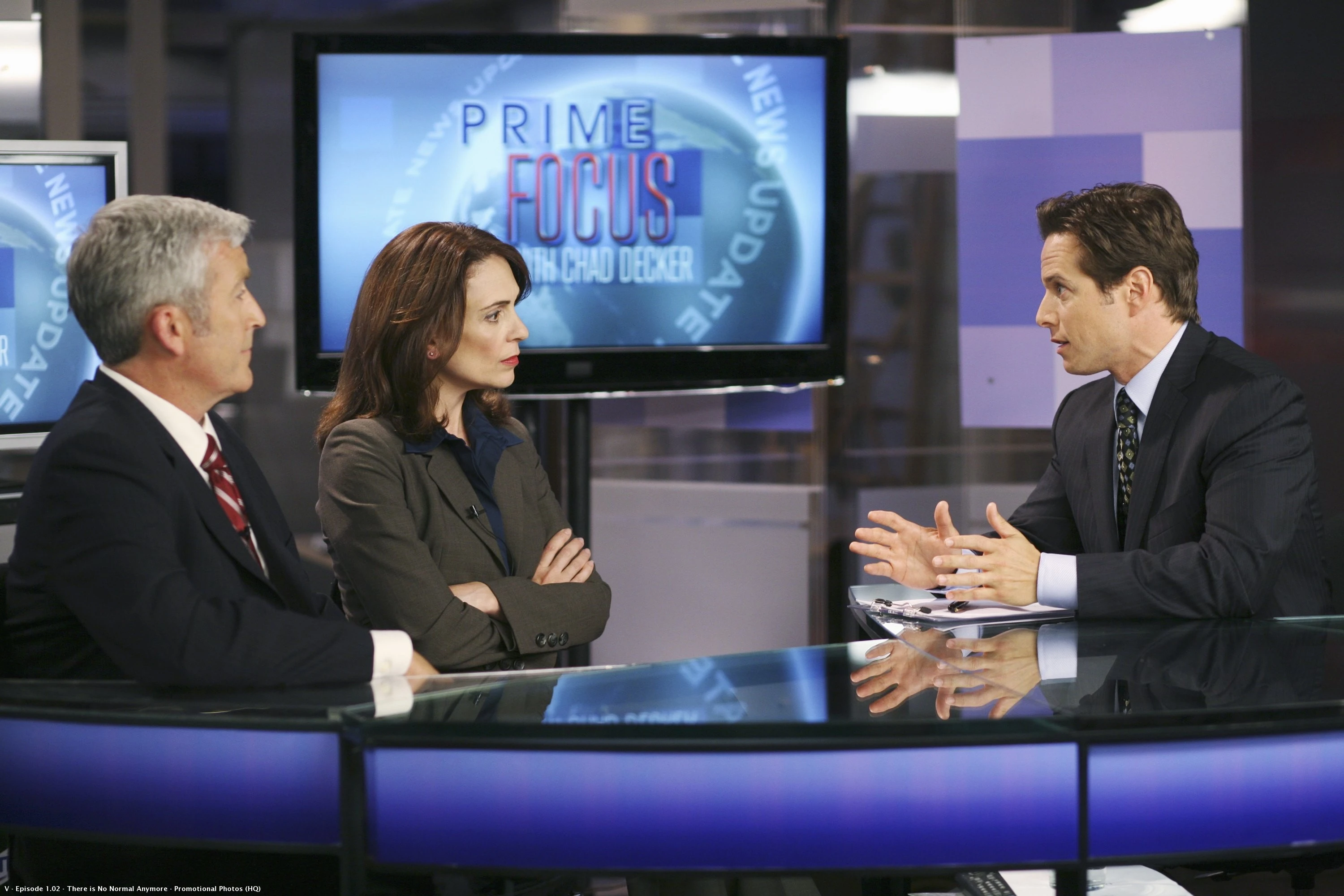 Reviewing poll numbers that show the Visitors' approval at about fifty percent, Chad expresses dismay that his reporting hasn't been adequate to inform the public. He devises a plan to encourage Anna to seek him. He invites two guests, Harold Stern and Marion Geiger to debate the presence of the Visitors, irking Anna. The plan works, producing an uptick in the poll, and paving the way for diplomatic relations between the Vs and the United States. Anna phones Chad and tersely thanks him after the announcement.